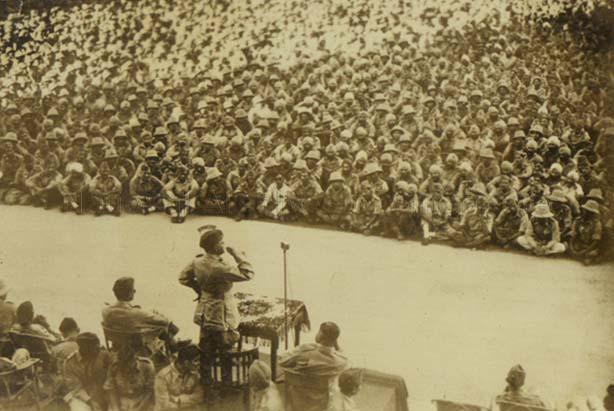 SUBHAS CHANDRA BOSE ADDRESSING INDIAN NATIONAL ARMY AT A RALLY, C1942-1945