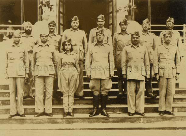 MEMBERS OF THE PROVISIONAL GOVERNMENT OF AZAD HIND. 1ST ROW (LEFT TO RIGHT): LIEUTENANT COLONEL CHATTERJEE, LIEUTENANT COLONEL J K BHONSLE, DR LAKSHMI, CHANDRA BOSE, A M SAHAY AND S A AYER. 2ND ROW (LEFT TO RIGHT): LIEUTENANT COLONEL GULZARA SINGH, LIEUTENANT COLONEL SHAH NAWAZ KHAN, LIEUTENANT COLONEL AZIZ AHMED, LIEUTENANT COLONEL M Z KIANI, LIEUTENANT COLONEL N S BHAGAT, LIEUTENANT COLONEL EHSAN QADIR, LIEUTENANT COLONEL LOGANATHAN
