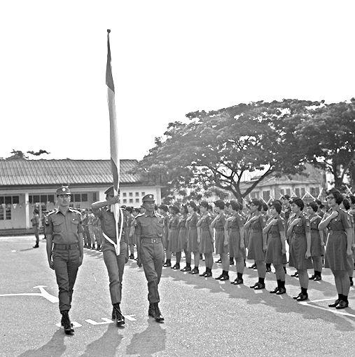 SINGAPORE CELEBRATED ITS FIRST EVER ARMED FORCES DAY WITH THE EMPHASIS ON RUGGEDNESS AND TOUGHNESS. THIS PICTURE WAS VIVIDLY STRUCK HOME BY 1,500 SERVICEMEN AND SERVICEWOMEN WHO PROVIDED THE GRAND FINALS TO A DAY FULL OF MUSTER PARADES, OPEN HOUSES, SALE OF FLAGS AND PLEDGES OF LOYALTY WITH A GRAND PARADE AND MARCH PAST AT SUNSET. PICTURE SHOWS THE NATIONAL FLAG IS PARADED AT THE MUSTER AT MINISTRY OF INTERIOR AND DEFENCE HEADQUARTERS FOR THE LOYALTY PLEDGE YESTERDAY MORNING