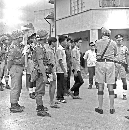 POLICE AND MILITARY UNITS KEPT UP THE PRESSURE WITH SECURITY SWEEPS IN VARIOUS PARTS OF THE ISLAND ALL DAY TO CONTAIN UNRULY ELEMENTS BEHIND THE VIOLENT INCIDENTS OF THE PAST FEW DAYS. ABOUT 100 PEOPLE - BOTH CHINESE AND MALAYS - WERE DETAINED FOR INTERROGATION DURING THESE OPERATIONS. PICTURE SHOWS A GROUP OF YOUTHS BEING SCREENED DURING THE RAID AT SIXTH AVENUE, BUKIT TIMAH