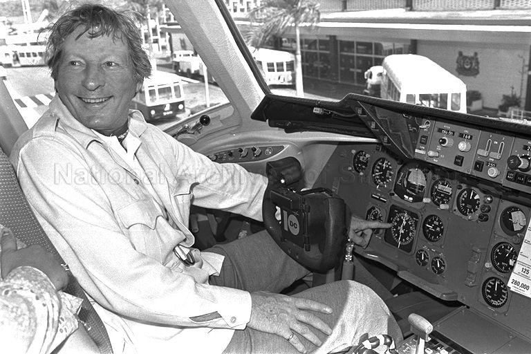 AMERICAN ACTOR AND COMEDIAN DANNY KAYE AT THE COCKPIT OF THE NEW MCDONNELL DOUGLAS DC-10 TRI-JET. ARRIVING AT THE SINGAPORE AIRPORT TODAY, HE WILL ACCOMPANY THE AIRCRAFT AROUND THE GLOBE ON A 'FRIENDSHIP' TOUR