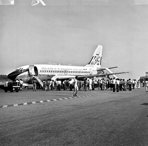 ONE OF THE FIRST FIVE BRAND NEW BOEING 737S, AN 85-SEATER JETLINER ORDERED BY MALAYSIA-SINGAPORE AIRLINES (MSA), FLEW INTO PAYA LEBAR AIRPORT FROM SEATTLE. THE $14 MILLION AIRCRAFT TOUCHED DOWN ON THE RUNWAY TO THE APPLAUSE FROM MORE THAN 100 AVIATION OFFICIALS. THE B-737 IS AS WIDE AS THE B-707 AND HAS 12 FIRST-CLASS AND 73 ECONOMY CLASS SEATS