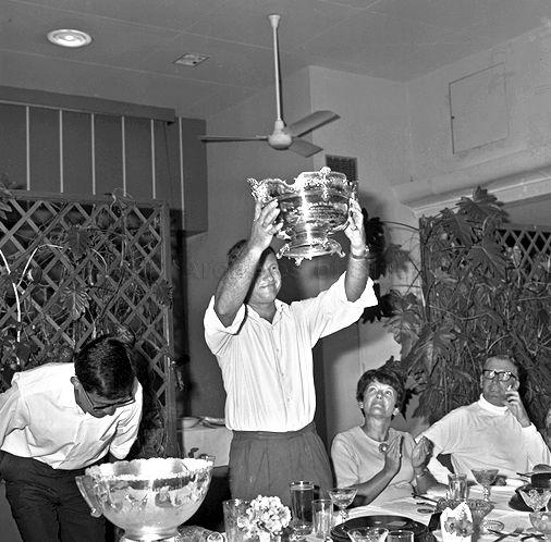 SINGAPORE ISLAND COUNTRY CLUB BEAT ROYAL SELANGOR GOLF CLUB IN THE MEN AND WOMEN'S MATCHES PLAYED OVER THE OLD ISLAND COURSE. PICTURE SHOWS THE SINGAPORE ISLAND COUNTRY CLUB SKIPPER H DYNE LIFTING THE LOKE WAN THO CUP