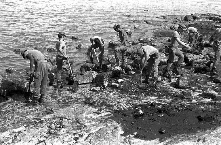 TANAH MERAH BEACH RUINED BY OIL POLLUTION. OIL HAD LEAKED FROM THE HULL O F 210,967 TON SHELL SUPERTANKER MYRTEA WHICH RAN AGROUND OFF PULAU BUKOM TWO DAYS AGO. PICTURE SHOWS SINGAPORE ARMED FORCES (SAF) PERSONNEL CLEANING UP THE BEACH