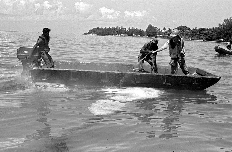 TANAH MERAH BEACH RUINED BY OIL POLLUTION. OIL HAD LEAKED FROM THE HULL O F 210,967 TON SHELL SUPERTANKER MYRTEA WHICH RAN AGROUND OFF PULAU BUKOM. PICTURE SHOWS SINGAPORE ARMED FORCES (SAF) PERSONNEL SPRAYING WATERS OFF TANAH MERAH WITH DETERGENT