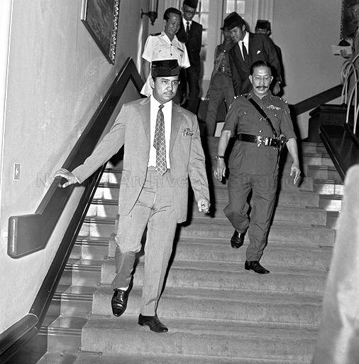 SULTAN HASSANAL BOLKIAH OF BRUNEI (LEFT) AND HIS FATHER SIR OMAR ALI SAIFUDDIN (RIGHT) AT THE ISTANA BUKIT SERENE. THEY WERE GIVEN A QUIET SEND-OFF BY SULTAN ISMAIL OF JOHORE AT THE END OF THEIR THREE-DAY VISIT TO THE STATE