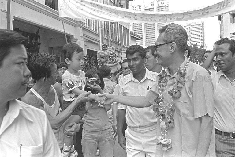 GENERAL ELECTIONS 1976. THE PEOPLE'S ACTION PARTY CANDIDATE FOR TANJONG PAGAR CONSTITUENCY LEE KUAN YEW TOURED THE AREA. A LARGE CROWD TURNED OUT TO GREET MR AND MRS LEE WHEN THEY TOURED IN AN OPEN PICK-UP VAN FOR MORE THAN THREE HOURS, MEETING THE PASSING PEOPLE AND SPEAKING TO THEM AT STREET CORNER RALLIES. HE ALSO MADE MANY HOUSE-TO-HOUSE CALLS.