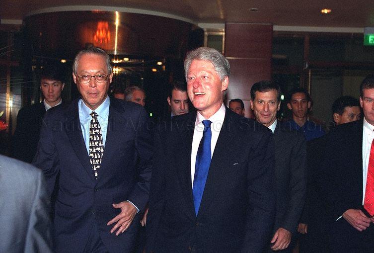 Prime Minister Goh Chok Tong and former United States President Bill Clinton having a chat as they proceed to Jade Restaurant, The Fullerton Singapore to attend a dinner hosted in honour of Mr Clinton