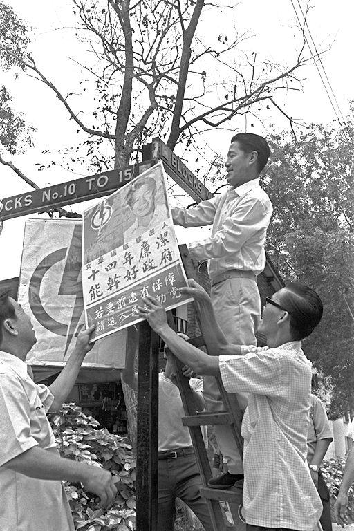SINGAPORE'S 138 ELECTION CANDIDATES WILL NOW HAVE THE TASK OF REMOVING THEIR POSTERS AND BANNERS WHICH THEY PUT UP AFTER NOMINATION DAY. THOUSANDS OF POSTERS WERE HUNG UP ON TREES AND LAMP POSTS, PASTED ON BUSES AND AT BUS SHELTERS AND BANNERS WERE STRUNG ACROSS BUILDINGS IN ALL THE 57 CONTESTED CONSTITUENCIES. SOME OF THE CANDIDATES AND THEIR ELECTION AGENTS, ARMED WITH LADDERS, WERE BUSY TAKING DOWN THEIR POSTERS AND BANNERS. AMONG THE FIRST TO DO SO WAS THE MINISTER FOR CULTURE JEK YEUN THONG (ON LADDER), WHO WAS RE-ELECTED TO QUEENSTOWN AFTER TROUNCING HIS UNITED NATIONAL FRONT AND WORKER'S PARTY OPPONENTS TO WIN BY A MAJORITY OF 10,921 VOTES