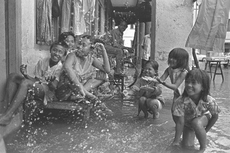 FLOODS AT KELANTAN LANE, OFF JALAN BESAR ROAD. A HOUSEWIFE WAITING FOR THE FLOODS TO SUBSIDE AS CHILDREN ENJOY THEMSELVES IN WATER. THE EARLY MORNING SUMATRA, TRAVELLING AT A SPEED OF 15-KNOTS LASHED THROUGH SINGAPORE FROM WEST TO EAST FLOODING SEVERAL LOW LYING AREAS