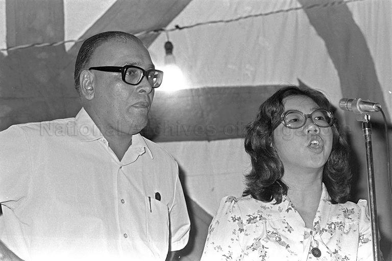 GENERAL ELECTIONS 1976. UNITED PEOPLE'S FRONT (UPF) RALLY AT BEACH ROAD. THE GENERAL SECRETARY OF UPF, HARBANS SINGH (LEFT) SAID THAT THE ONLY SALVATION FOR SINGAPORE WAS TO BE FRIENDLY WITH SOCIALIST COUNTRIES. HE SAID "...A SOCIALIST GOVERNMENT MUST TAKE OVER IN SINGAPORE OTHERWISE YOUR FUTURE IS DOOMED". MR SINGH IS CHALLENGING THE PRIME MINISTER LEE KUAN YEW AT THE TANJONG PAGAR CONSTITUENCY. ON THE RIGHT IS ANG BEE LIAN FROM THE UPF.