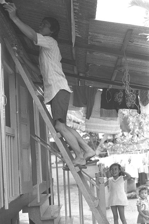 A MAN PAINTING HIS HOUSE AT KAMPONG WAK TANJONG IN PREPARATION FOR HARI RAYA
