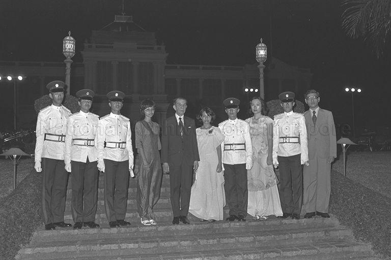 PRESIDENT'S SCHOLARS POSE WITH PRESIDENT BENJAMIN HENRY SHEARES AFTER THE PRESENTATION OF THE PRESIDENT'S SCHOLARSHIP AT THE ISTANA. THE SCHOLARS ARE BELITA ONG SOON HUA, 18, YONG KWEE LAN, 20, GAN JUAY KIAT, LEE HSIEN YANG (THIRD FROM LEFT, PRIME MINISTER LEE KUAN YEW'S YOUNGER SON), 18, SEE HON SUN, 18, THAM KUI SENG, 18, MICHAEL LOW OON HOE, 19, POH HEAN LEE, 19 AND BELINDA MURUGASU (FIFTH FROM RIGHT), 18.