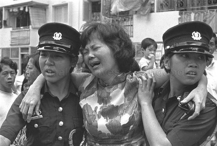 A FIRE BROKE OUT AT BLOCK 60, LORONG 4, TOA PAYOH. MADAM LIM KIM ENG, 40, A MAID SERVANT, WHOSE FLAT WAS ON THE EIGHTH FLOOR, BROKE DOWN AND WEPT AS FIREMEN FOUGHT TO BRING THE BLAZE UNDER CONTROL. HER FLAT WAS DESTROYED AND SIX OTHERS WERE PARTIALLY BURNT, BUT NO ONE WAS HURT. PICTURE SHOWS TWO POLICEWOMEN HELPING A SOBBING MADAM LIM AWAY FROM THE BURNING FLAT