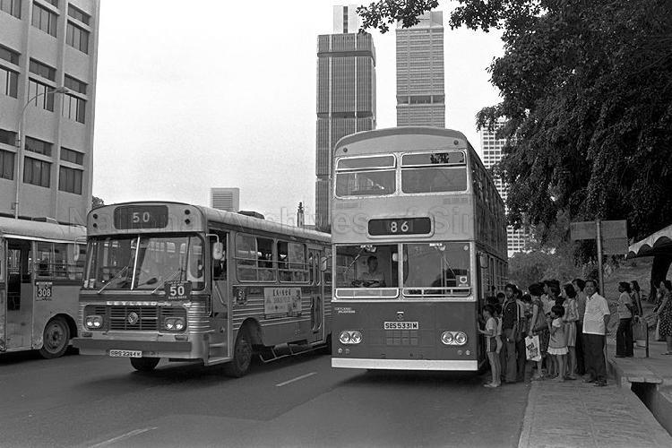 SINGAPORE'S FIRST DOUBLE-DECKER BUSES ON THE ROAD. THE NEW SERVICE 86 WAS LAUNCHED BY SENIOR MINISTER OF STATE FOR COMMUNICATIONS ONG TENG CHEONG
