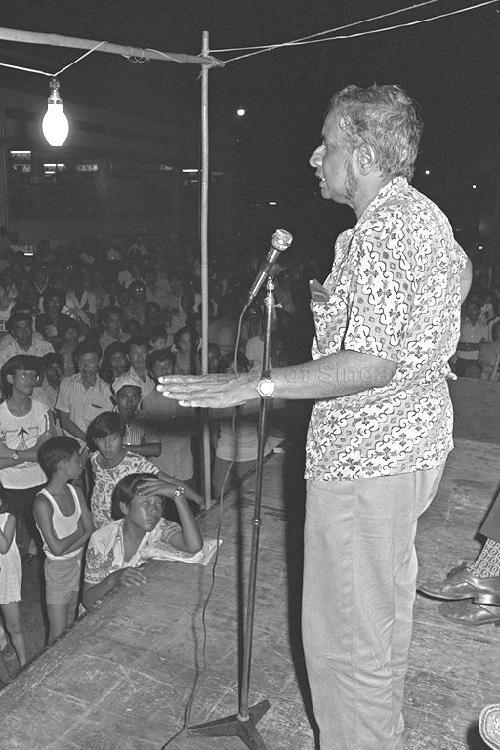 GENERAL ELECTIONS 1976. WORKERS' PARTY (WP) RALLY AT DUNMAN ROAD. THE WP SECRETARY-GENERAL J B JEYARETNAM SAID THAT AT PEOPLE'S ACTION PARTY (PAP) RALLIES, THERE WAS NO MENTION OF WHAT THEY ARE GOING TO DO FOR THE PEOPLE. THERE WERE ONLY ATTACKS AGAINST THE OPPOSITION PARTIES. HE SAID MEMBERS OF PARLIAMENT, SO FAR, HAD ONLY SUPPORTED THE POLICIES OF THE GOVERNMENT AND NOT REALLY REPRESENTED THE PEOPLE FOR THE PAST 11 YEARS. JEYARETNAM WAS ADDRESSING DUNMAN ROAD RESIDENTS IN SUPPORT OF THE WP CANDIDATE FOR GEYLANG EAST, KUM TENG HOCK, WHO FACES HO CHENG CHOON OF THE PAP