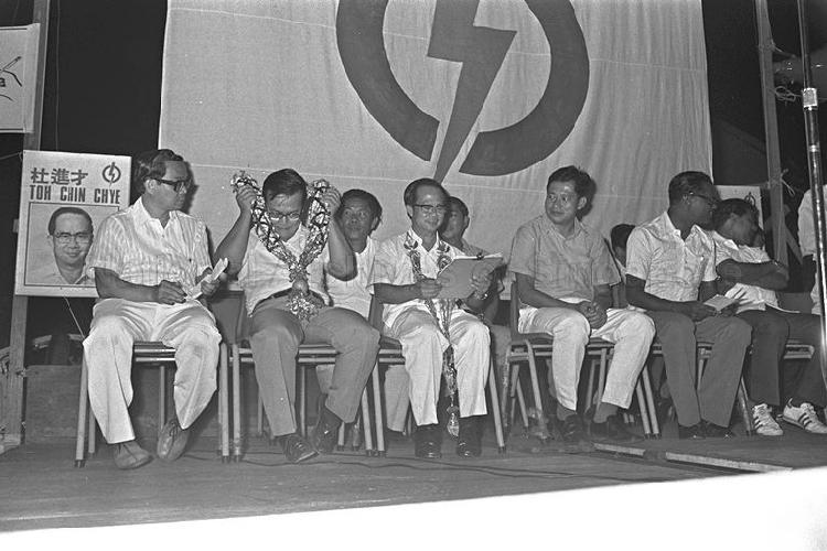 GENERAL ELECTIONS 1976. A PEOPLE'S ACTION PARTY (PAP) RALLY AT KAMPONG KAPOR. THE PAP CANDIDATE FOR ROCHORE CONSTITUENCY DR TOH CHIN CHYE (CENTRE) IS CHALLENGED BY DR LEE SIEW CHOH OF THE BARISAN SOSIALIS IN THE WARD. MEMBER OF PARLIAMENT FOR ANG MO KIO YEO TOON CHIA AND MEMBER OF PARLIAMENT FOR JALAN BESAR CHAN CHEE SENG (BOTH RETURNED UNOPPOSED ON NOMINATION DAY) LATER ADDRESSED RESIDENTS OF KAMPONG KAPOR AREA IN SUPPORT OF DR TOH