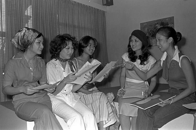 SINGAPORE BEAUTY QUEEN PAULINE CHEONG (RIGHT) WHO MADE IT TO THE SEMI-FINALS IN THE MISS WORLD CONTEST IN LONDON IN 1976, WENT SCOUTING ON SATURDAY FOR ENTRANTS TO THIS YEAR'S MISS SINGAPORE/MISS WORLD CONTEST. THE AIM IS TO HAVE AS MANY CONTESTANTS FOR A BETTER SELECTION OF A WINNER WHO WILL DO SINGAPORE PROUD AT THE MISS WORLD CONTEST IN LONDON IN NOVEMBER. PICTURE SHOWS PAULINE (RIGHT) TRYING TO RECRUIT MODEL TRAINEES FOR THE CONTEST AT A MODELLING AGENCY