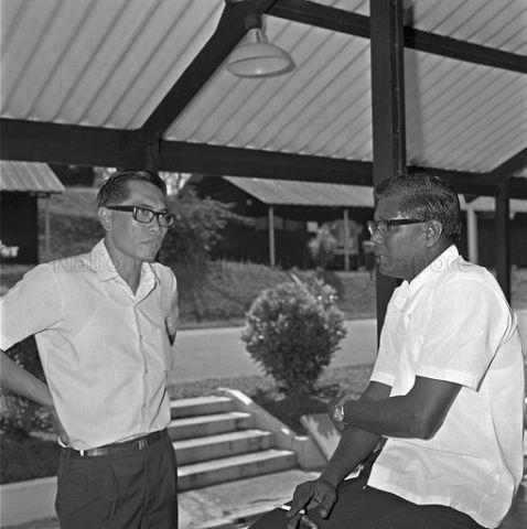 TWELVE SINGAPORE SCHOOLBOYS LEFT BY TRAIN TO SPEND THEIR SECOND TERM HOLIDAYS SHOOTING THE RAPIDS IN THE JUNGLE OF KELANTAN. THE BOYS ARE FROM THE SANG NILA UTAMA SECONDARY SCHOOL AND THE NEW TOWN SECONDARY SCHOOL. FOUR ENGLISH LADS ON HOLIDAY HERE ARE ALSO INCLUDED IN THE TEAM. THE ONLY HELP THEY WILL GET ON THIS RUGGED SOCIETY-TYPE ADVENTURE IS FROM TWO SECOND LIEUTENANTS, SWADI OSMAN (RIGHT) AND SEOW CHENG HOE (LEFT), AND EIGHT MEN FROM THE SINGAPORE GUARD REGIMENT WHO WILL ACT AS GUIDES. THE ADVENTURERS ARE DUE TO BE BACK ON 23 AUGUST
