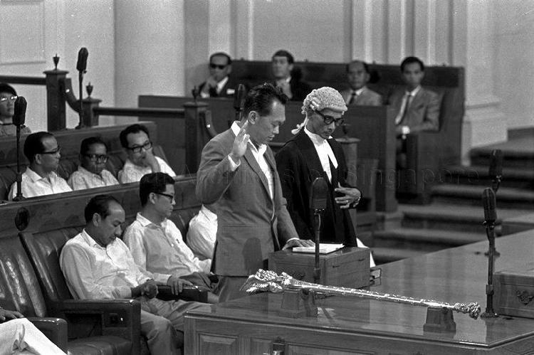 PRIME MINISTER LEE KUAN YEW TAKING THE OATH OF ALLEGIANCE AT THE FIRST MEETING OF THE NEWLY-ELECTED ALL PEOPLE'S ACTION PARTY (PAP) PARLIAMENT. ALL 58 MEMBERS OF THE PAP TOOK THE OATH OF ALLEGIANCE TO DISCHARGE THEIR DUTIES TO THE BEST OF THEIR ABILITY, BEAR TRUE FAITH AND ALLEGIANCE TO THE REPUBLIC, AND PRESERVE, PROTECT AND DEFEND THE CONSTITUTION.