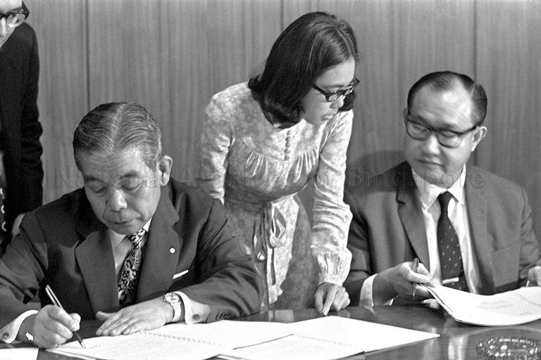 PRESIDENT OF THE DEVELOPMENT BANK OF SINGAPORE (DBS) HOWE YOON CHONG (RIGHT) AND T YAMAUCHI OF DAIWA SECURITIES COMPANY LIMITED OF JAPAN, ONE OF JAPAN'S BIG FOUR SECURITIES COMPANIES, SIGNING AN AGREEMENT OF A JOINT VENTURE AGREEMENT BETWEEN DBS AND DAIWA SECURITIES AT THE INDUSTRIAL AND COMMERCIAL BANK BUILDING. THE NEW FIRM SET UP WILL PROMOTE THE ASIAN DOLLAR BOND MARKET. PICTURE SHOWS T YAMAUCHI AND HOWE YOON CHONG SIGNING THE AGREEMENT ASSISTED BY MISS TAN SOEK BEE, LEGAL OFFICER OF DBS