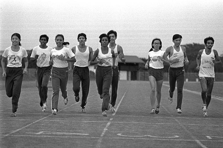 NATIONAL ATHLETES (FROM LEFT) CHEE SWEE LEE, C KUNALAN, SHEILA FERNANDO, GODFREY JALLEH, MAIMOON AZLAN, CHEAH KIM TECK, GAN BEE WAH, HO MUN CHEONG AND SERJIT SINGH, DURING THEIR FINAL TRAINING SESSION AT NATIONAL STADIUM PRACTICE TRACK. THE TEAM WILL BE LEAVING FOR MANILA THE FOLLOWING DAY FOR THE 1ST ASIAN TRACK AND FIELD CHAMPIONSHIPS