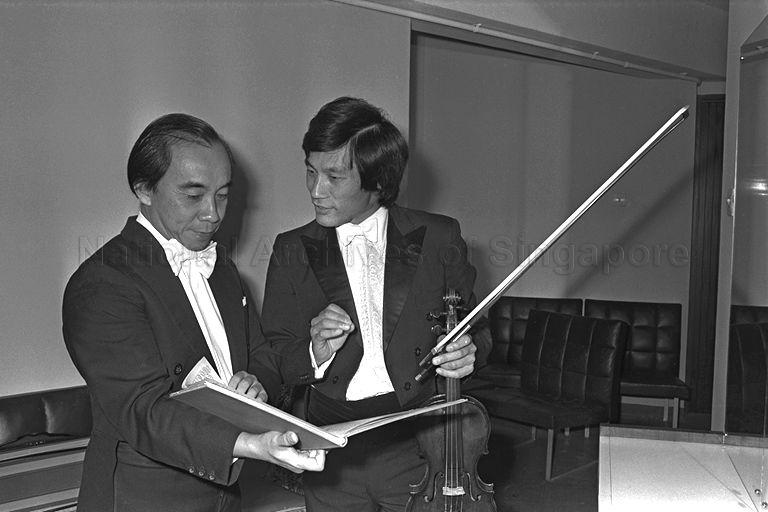VIOLIN VIRTUOSO LEE PAN HOON (RIGHT) AND SINGAPORE SYMPHONY ORCHESTRA (SSO) CONDUCTOR CHOO HUEY (LEFT) CONFERRING WITH EACH OTHER, ON THE OCCASION OF AN SSO CONCERT AT THE SINGAPORE CONFERENCE HALL