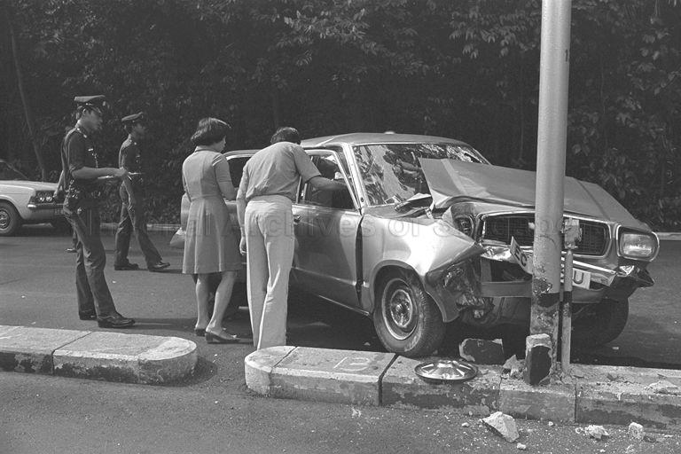 ACCIDENT AT HOLLAND ROAD. MISS YEO BEE LIAN, 24, THE DRIVER OF THIS CAR WAS INJURED WHILE HER SISTER BEE HWA SUFFERED SEVERE FACIAL INJURIES WHEN HER HEAD CRASHED THROUGH THE WINDSCREEN. THE ACCIDENT OCCURRED WHEN THE CAR THEY WERE TRAVELLING IN RAMMED INTO A LAMP-POST