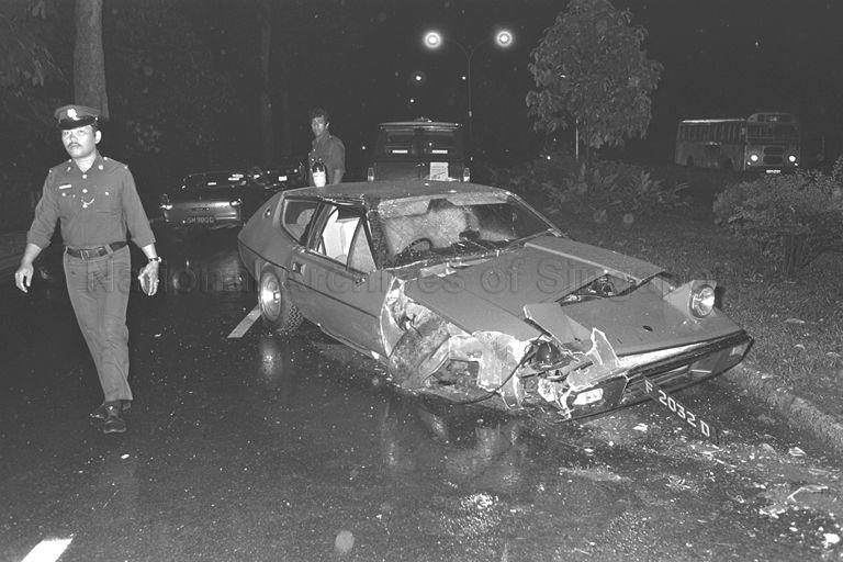 ACCIDENT AT STEVENS ROAD. THIS $100,000 LOTUS ELITE WAS SEVERELY DAMAGED WHEN IT HIT A TREE AT A SHARP BEND NEAR THE TANGLIN CLUB. LONG FOO JIN, THE DRIVER OF THE CAR, ESCAPED WITH A SLIGHT CUT ON HIS HEAD WHILE HIS PASSENGER, TAN WEE KIT SUFFERED A GASH ALONG HIS FOREHEAD. THIS CAR IS BELIEVED TO BE ONE OF ONLY TWO IN SINGAPORE