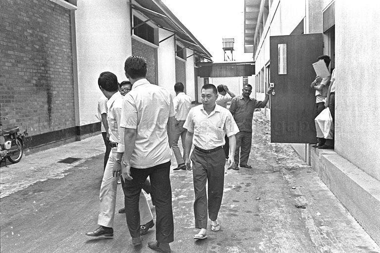 THE CHAIRMAN AND MANAGING DIRECTOR OF NANYANG SIANG PAU, LEE EU SENG (LEFT), 43, WAS DETAINED BY THE GOVERNMENT. LEE, A CHIEF EXECUTIVE OF THE NEWSPAPER, A FAMILY CONCERN OF WHICH HE IS THE MAIN SHAREHOLDER, WAS PICKED UP AT THIS BROTHER'S HOME IN CITY TOWERS. THE GOVERNMENT WITHDREW THE NANYANG SIANG PAU PRINTING PERMIT ISSUED TO MR LEE AND RE-ISSUED IT IN THE NAME OF THE SENIOR EDITOR TAN CHIN HAR. THE GOVERNMENT WARNED THAT NO PROPRIETOR, EDITOR OR REPORTER SHOULD ALLOW HIMSELF TO BE USED BY FOREIGN INTERESTS. PICTURE SHOWS LEE EU SENG LEAVING THE NEWSPAPER PREMISES IN ALEXANDRA ROAD YESTERDAY AFTER HE WAS DETAINED
