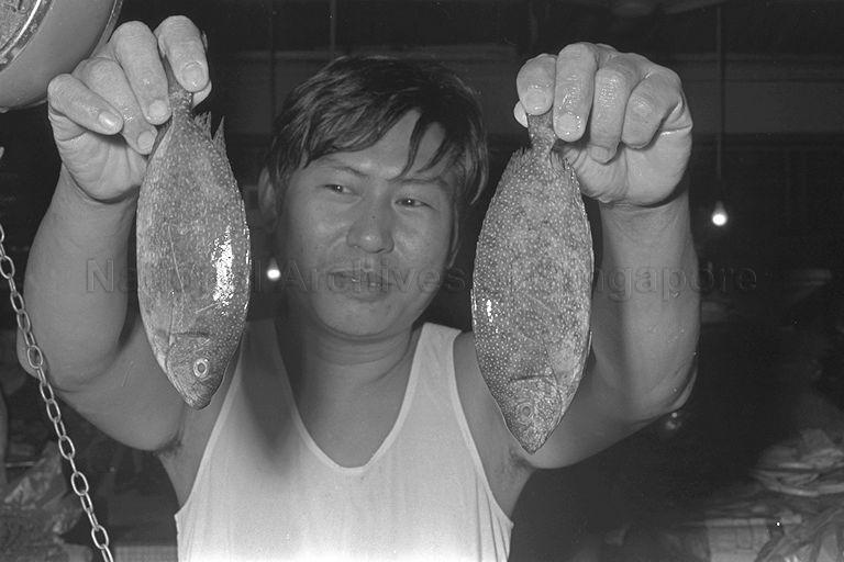 A FISHMONGER HOLDING UP TWO PAI-TU FISH WHICH COST BETWEEN $30 AND $40 PER 605 GRAMMES. THIS FISH IS THE MOST POPULAR DISH FOR THE CHINESE NEW YEAR REUNION DINNER