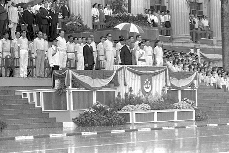 National Day Parade 1968 at the Padang - View of President Yusof Ishak, Prime Minister Lee Kuan Yew, Members of Parliament and dignitaries standing at City Hall steps during the National Anthem