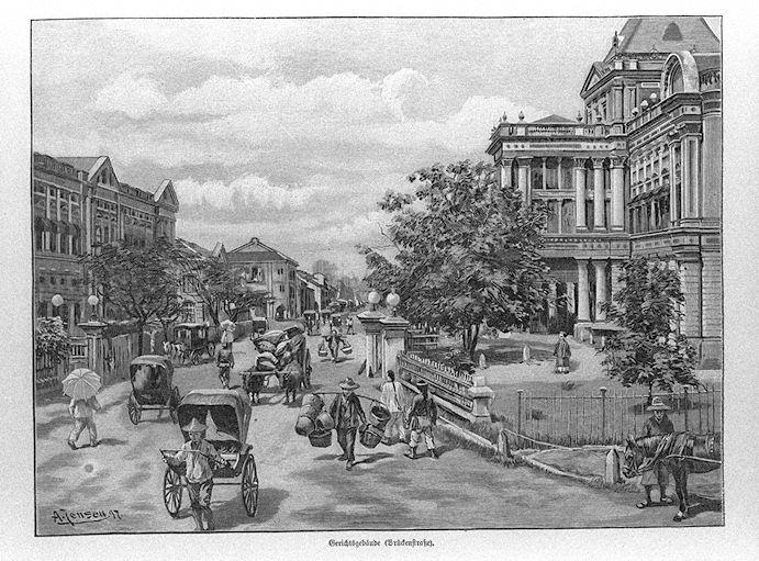 SKETCH DEPICTING STREET SCENE OF SOUTH BRIDGE ROAD SHOWING THE POLICE COURT (RIGHT) AND CENTRAL POLICE STATION (LEFT)