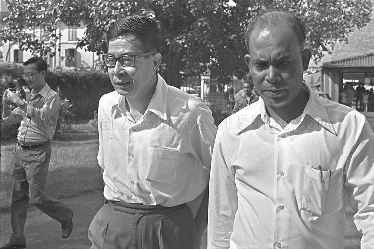 THE MINISTER OF STATE FOR ENVIRONMENT WEE TOON BOON, 45, WAS RELEASED ON BAIL OF $50,000 IN TWO SURETIES AFTER HE WAS CHARGED IN THE FIRST MAGISTRATE'S COURT WITH FIVE COUNTS OF CORRUPTION INVOLVING $839,023. PICTURE SHOWS WEE (LEFT) ESCORTED TO COURT BY MR TAMBIAH (RIGHT)