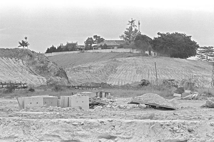PROGRESS HAS ENCROACHED ON THE TSO TOH AUM CHINESE TEMPLE AT UPPER CHANGI ROAD. BUT IT IS STILL HOLDING FORT ATOP A HILL ALTHOUGH OTHER BUILDINGS AROUND IT HAVE BEEN PULLED DOWN AND THE SURROUNDING AREA LEVELLED TO MAKE ROOM FOR RE-DEVELOPMENT PROJECTS. THE FUTURE OF THE 34-YEAR OLD TEMPLE IS HOWEVER VERY SHAKY FOR IT TOO WILL HAVE TO GIVE WAY TO PROGRESS. BUT WHEN, NO ONE KNOWS FOR CERTAIN