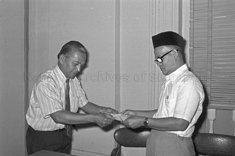 A REPRESENTATIVE FROM MAJLIS UGAMA ISLAM SINGAPURA (MUIS) RELIGIOUS COUNCIL (LEFT) HANDING A CHEQUE FOR AHMAD IBRAHIM MOSQUE AT EMPRESS PLACE, SINGAPORE. RECEIVING THE CHEQUE ON BEHALF OF THE MOSQUE IS INCHE AHMAD MOHAMED IBRAHIM