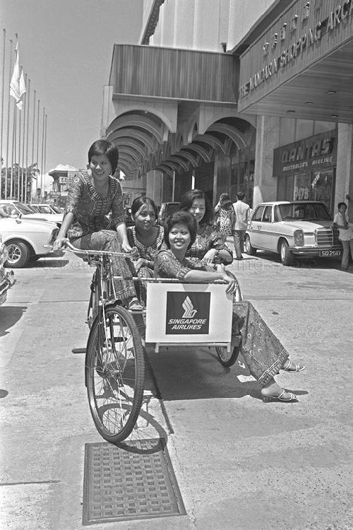 SINGAPORE AIRLINES (SIA) STEWARDESSES TAKING A TRISHAW RIDE OUTSIDE THE SIA OFFICE IN MANDARIN HOTEL. THEY ARE (SEATED IN FRONT) YVONNE V DEVI COPAL (LEFT), PATRICIA LEE, TAN CHOO YOU (BACK LEFT) AND IRENE LIM. THEY WERE CHOSEN FROM AMONG 300 AIR STEWARDESSES FROM SIA TO 'SELL' SINGAPORE TO BRITONS UNDER THE SECOND SIA-UNITED KINGDOM TRISHAW PROMOTION CAMPAIGN