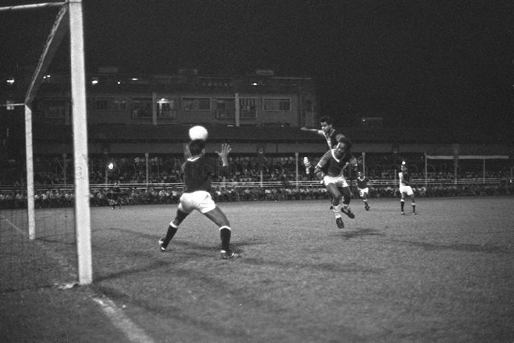 MALAYSIA CUP SOCCER MATCH BETWEEN SINGAPORE AND NEGRI SEMBILAN AT JALAN BESAR STADIUM. SINGAPORE BEAT NEGRI SEMBILAN 8-1 TO AVENGE A FIRST ROUND 4-1 DEFEAT SUFFERED A FORTNIGHT AGO. NEGRI SEMBILAN GOALKEEPER RAMACHANRA SAVES A HEADER FROM SINGAPORE'S CENTRE-FORWARD MAHAT AMBU