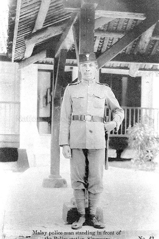 MALAY POLICEMAN STANDING IN FRONT OF POLICE STATION, SINGAPORE