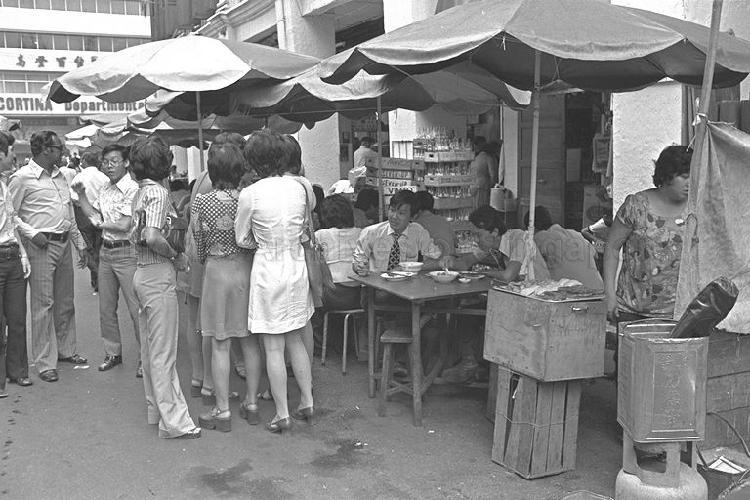 HOCK LAM STREET, JUST OFF NORTH BRIDGE ROAD, IS ONE OF SINGAPORE'S MOST FAMOUS EATING SPOT. IT WILL SOON HAVE TO MAKE WAY FOR URBAN RENEWAL. IT IS A BUSTLING NARROW ALLEY OF CENTURY-OLD SHOPHOUSES, STALLS, AND DURING LUNCHTIME IS CROWDED WITH HUNGRY CUSTOMERS