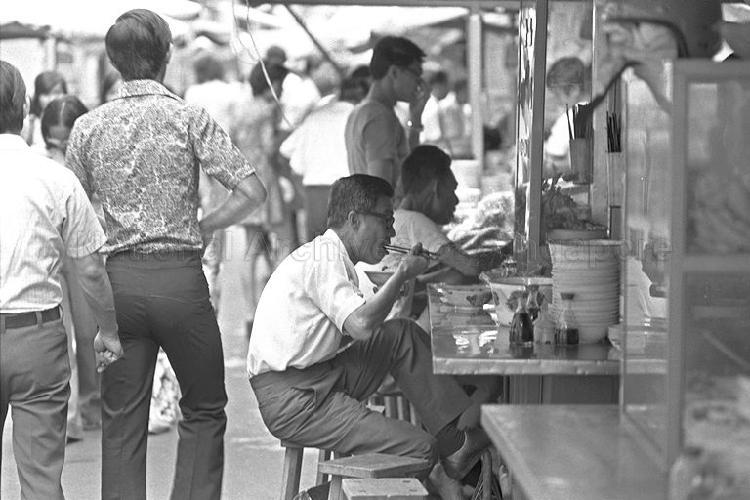 THIS IS HOCK LAM STREET, JUST OFF NORTH BRIDGE ROAD, ONE OF SINGAPORE'S MOST FAMOUS EATING SPOTS WHICH WILL SOON HAVE TO MAKE WAY FOR URBAN RENEWAL. IT IS A BUSTLING NARROW ALLEY OF CENTURY-OLD SHOPHOUSES, STALLS, AND DURING LUNCHTIME CROWDED WITH HUNGRY CUSTOMERS