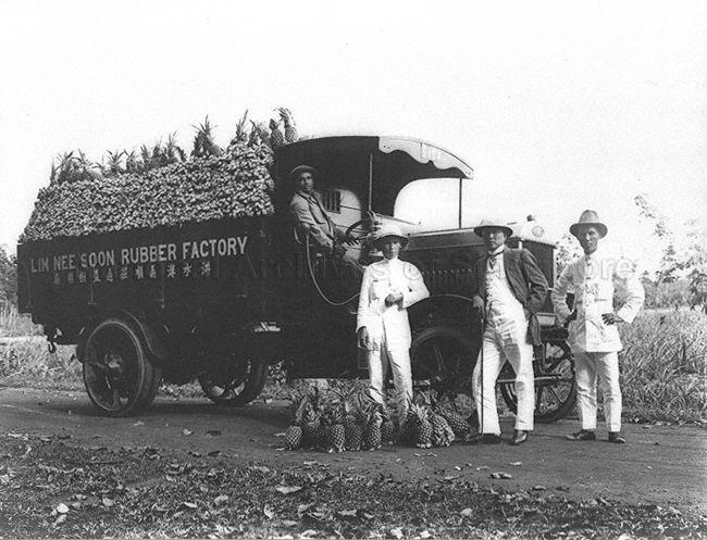 LIM NEE SOON IN FRONT OF HIS LORRY OR MOTOR TRUCK FULLY LOADED WITH PINEAPPLES