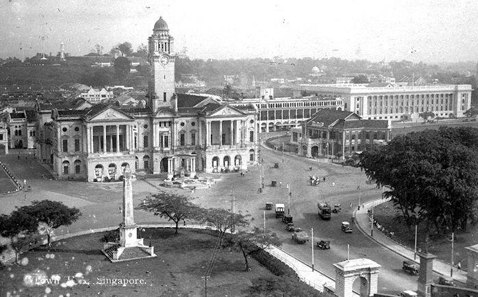 View of Empress Place, Singapore. On the left in the foreground is the Dalhousie Obelisk and buildings, from left, include Victoria Theatre and Memorial Hall, the Europe Hotel, Municipal Building (now City Hall) and Singapore Cricket Club (centre, right).