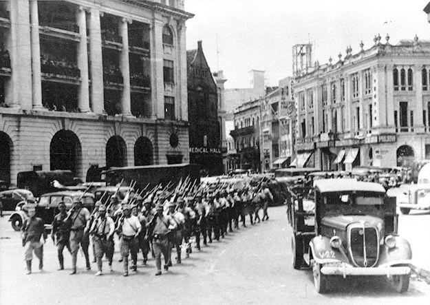 JAPANESE TROOPS MARCHING INTO RAFFLES SQUARE AFTER SURRENDER