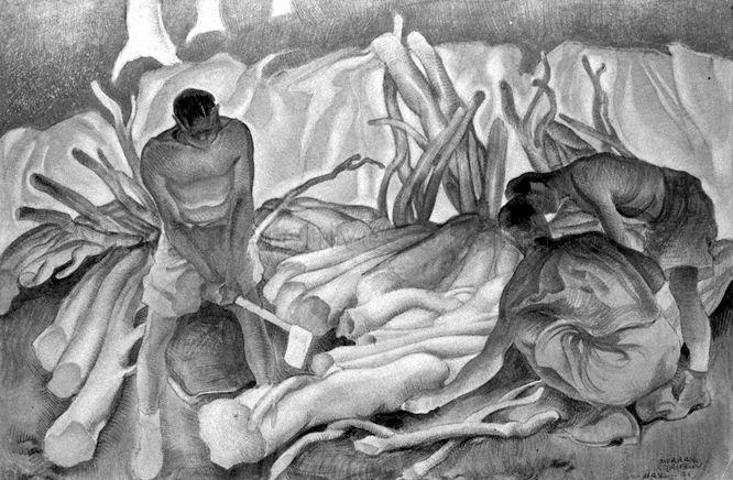 CUTTING UP RUBBER LOGS FOR FIREWOOD AT CHANGI BY MURRAY GRIFFIN IN WATERCOLOUR