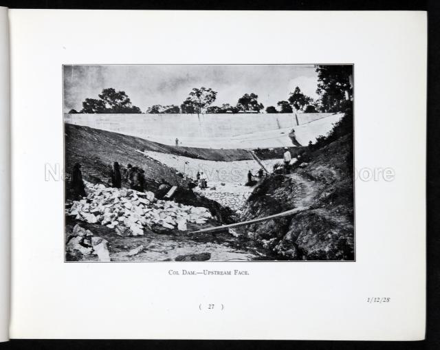 SINGAPORE WATER WORKS - HISTORICAL SKETCH OF WATER SUPPLY FROM JOHORE. PUBLISHED TO MARK THE COMPLETION OF THE RESERVOIR AT PONTIAN KECHIL. PICTURE SHOWS UPSTREAM FACE OF COL DAM