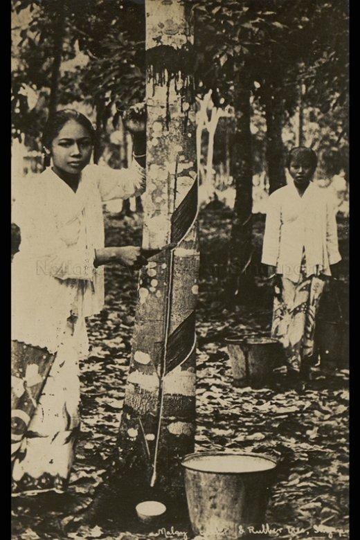 MALAY GIRL TAPPING RUBBER TREE, SINGAPORE