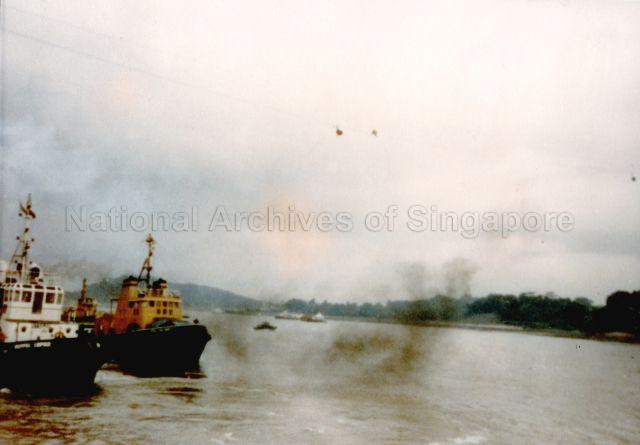 IMAGE DEPICTS PETROLEUM LEAK AFTER OIL RIG ENIWETOK COLLIDED WITH THE SENTOSA CABLEWAY