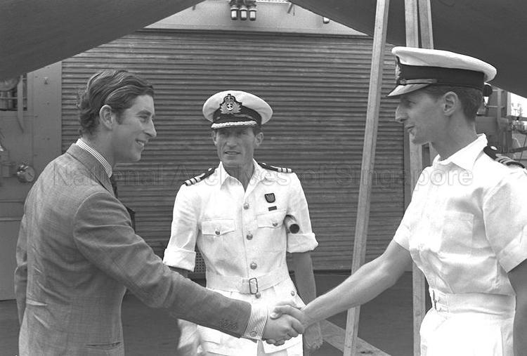 ROYAL SAILOR PRINCE CHARLES FLEW INTO SINGAPORE TO JOIN THE 2,200 TON FRIGATE HMS JUPITER AT THE ANZUK NAVAL BASE AS A NAVAL LIEUTENANT. PRINCE CHARLES ARRIVED AT TENGAH AIRBASE AT 11.35 AM ON AN RAF VC10 AIRCRAFT FROM GAN IN THE MALDIVE ISLANDS. THE HEIR TO THE BRITISH THRONE WAS RECEIVED BY THE CAPTAIN OF HMS JUPITER, COMMANDER JOHN GUNNING AT THE NAVAL BASE. PICTURE SHOWS PRINCE CHARLES (LEFT) SHAKING HANDS WITH HMS JUPITER'S FIRST LIEUTENANT COMMANDER JOHN DYKES. LOOKING ON IS FRIGATE'S CAPTAIN COMMANDER JOHN GUNNING