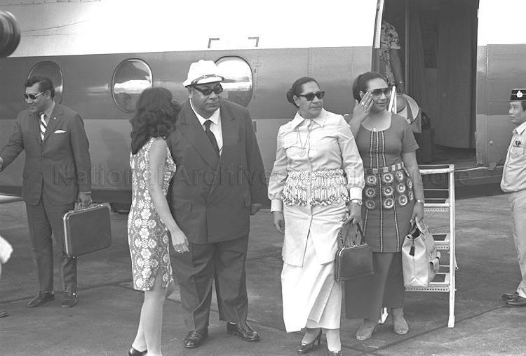 KING TAUFA'AHAU TUPOU IV (THIRD LEFT), QUEEN HALAEVALU MATA'AHO (THIRD RIGHT) AND THEIR DAUGHTER PRINCESS SALOTE PILOLEUV (SECOND RIGHT) OF TONGA ARRIVED IN SINGAPORE FROM KUALA LUMPUR. THE ROYAL TRIO ARE HERE ON A FOUR-DAY PRIVATE VISIT AND WILL STAY AT THE ISTANA. THIS IS THE ROYAL COUPLE'S SECOND VISIT TO SINGAPORE. THEY CAME HERE ON A PRIVATE VISIT IN 1971